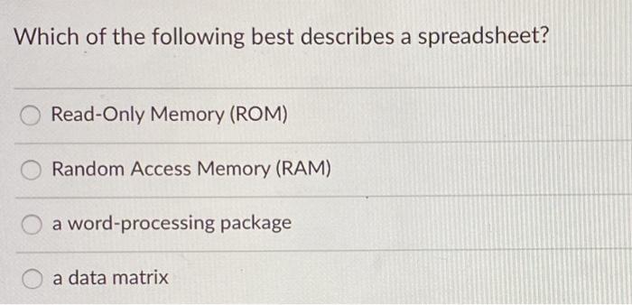 Solved Which Of The Following Best Describes A Spreadsheet Chegg Com